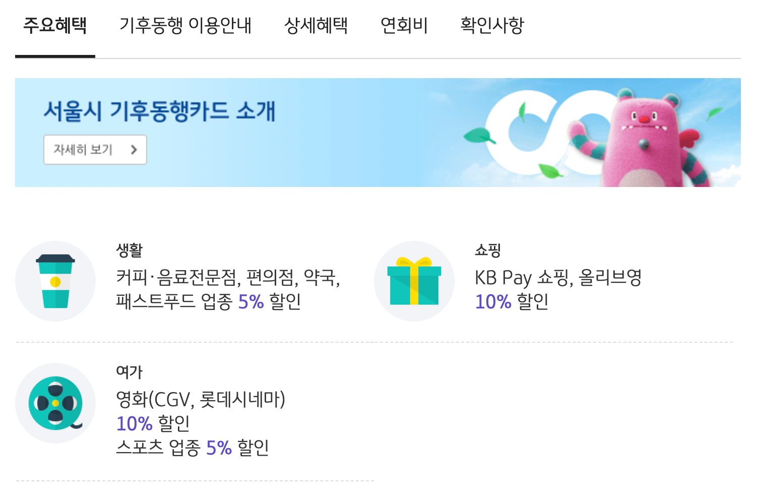 온라인 쇼핑몰/편의점/커피전문점/대중교통/도서 : 할인율 10%