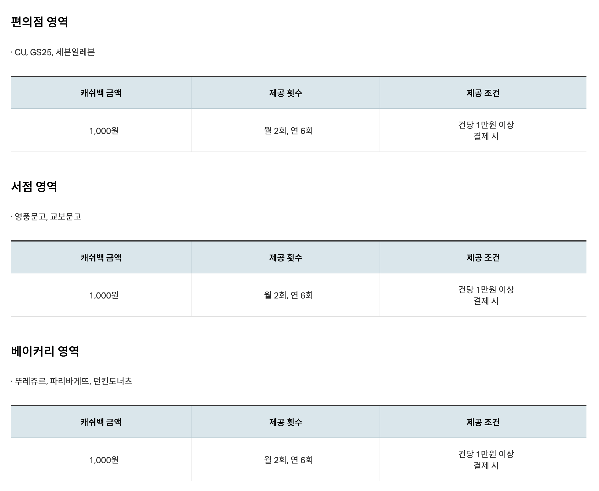 편의점/서점/베이커리 캐시백 : 1만원 이상 결제 시 1,000원